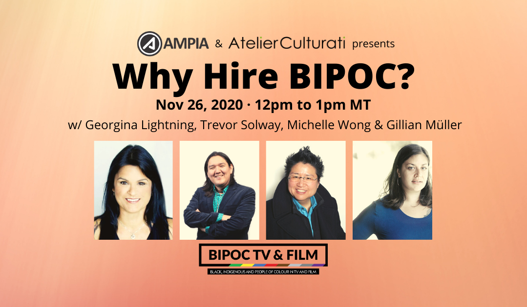 WHY HIRE BIPOC? In this unprecedented time Alberta’s film + television industry has an incredible opportunity to start making its productions more inclusive and diverse, by creating real opportunities for media professionals who are Black, Indigenous and People of Colour. Industry pros provide insight to understand why you should hire BIPOC and invaluable advice on how to approach it. This live, online event featured Georgina Lightning (Trickster), Trevor Solway (Intertribal), Michelle Wong (Heartland) and Gillian Müller from BIPOC TV & FILM, creators of the database HireBIPOC.com.