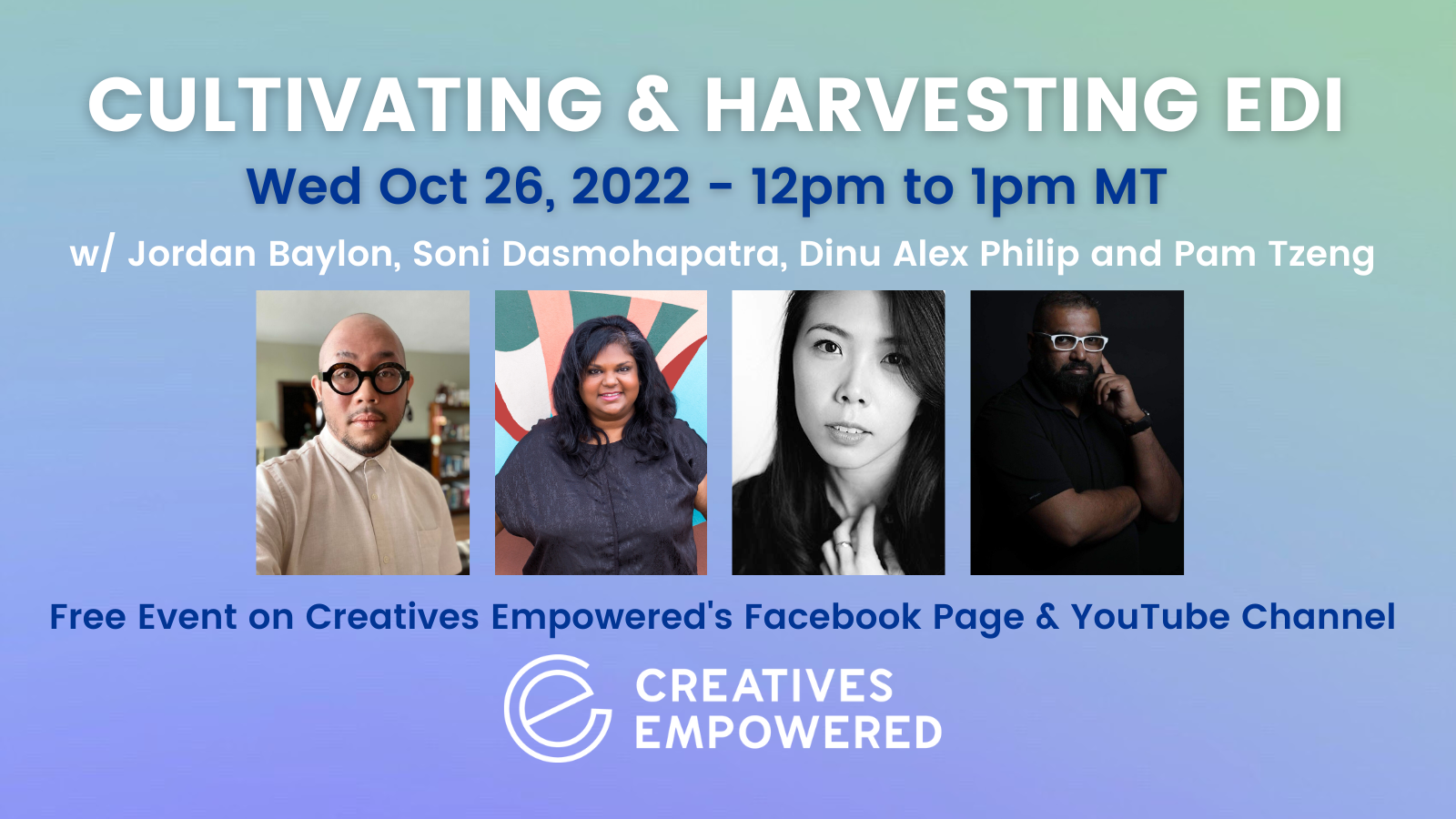 CULTIVATING & HARVESTING EDI – to cultivate means to acquire or develop, and to harvest means to collect or obtain for a future use. Since the summer of 2020, equity, diversity and inclusion (EDI) has become ‘top of mind’ throughout the cultural sector, and a priority in funding. Who is cultivating and harvesting EDI, and the money that’s available for it? And is the equity-seeking community actually being empowered in the process? This insightful discussion explored these questions, and the complex issues that can arise from this important work, with incredible panelists Jordan Baylon, Soni Dasmohapatra, Dinu Philip Alex and Pam Tzeng.