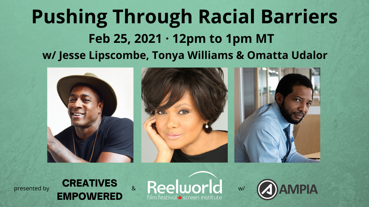 PUSHING THROUGH RACIAL BARRIERS – this live, online event was a powerful and enlightening discussion on the challenges racialized talent face in Alberta’s screen-based industries – from emerging to established – and the solutions we all need to see. We share practical and supportive resources you can access now to create more opportunity and equity. Featuring actor, producer, award-winning entrepreneur and activist Jesse Lipscombe, Emmy nominated Tonya Williams – the Founder and Executive Director of Reelworld, and award-winning Nigerian-Canadian filmmaker Omatta Udalor.
